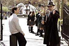 Sam: Yes there was a DVD crew that was there all the time, it's was just like 3 rowdy looking guys with a video camera. I didn't like the idea at all at first cause I really like to be private making the movies. The more I think about it now that you asked me I really don't like the idea at all. (Laughs) I don't like shows, I don't like to put on a show, I just really want to work intimately with my actors. But they say "Oh don't worry if you don't want that stuff in there it doesn't have to be in" but there always there and after a while I don't think about them. Long pause I 'm starting to think about them now. (Laughs) Was there any shoot that didn't make it on the screen that will be on the DVD? What plans have you made for the DVD? Sam: Most of what was shot in the movie made it into the movie, there's a scene in a shoe store its about a 2 minute scene. There's a scene with JJ Jameson about a 1-minute scene. And then there's like 10 seconds here where something was too slow or a 15 second clip here where some piece of information was made clear by a visual, which I didn't realize when we were working on the script so I realize that the audience didn't need that or some entrances was too slow, I'd start the scene in mid-dialogue. But pretty much what we plan was in the picture, I don't really have a lot of stuff to put in. What about the DVD in general, have you made any plans? Sam: Sony Pictures has this whole DVD Dept now that does nothing but make these special featurettes, so they've got this incredible amount of behind the scenes making of the costume, the effects behind Spider-Man, special this and that I couldn't say everything but I know they've got a really big plan for that. Going back to Tobey's back issue, there's a joke about that in the film where did that come from? Was that from you, or was it from Tobey?